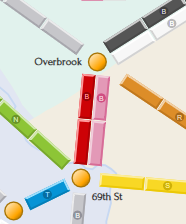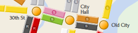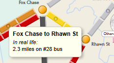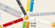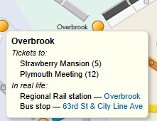 To keep things real we wanted each station to be a SEPTA stop, and each connection between stations to be a one-seat SEPTA ride. You can see the results in the online board by hovering overtapping a station or connection — for example: