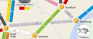 Each route on the Ticket to Ride Philly board has a small circled letter on one of its train spaces, located near the center of the route. The letter tells which mode of public transportation that route uses in real life. (Hover overTap any route in the online board for more info.)